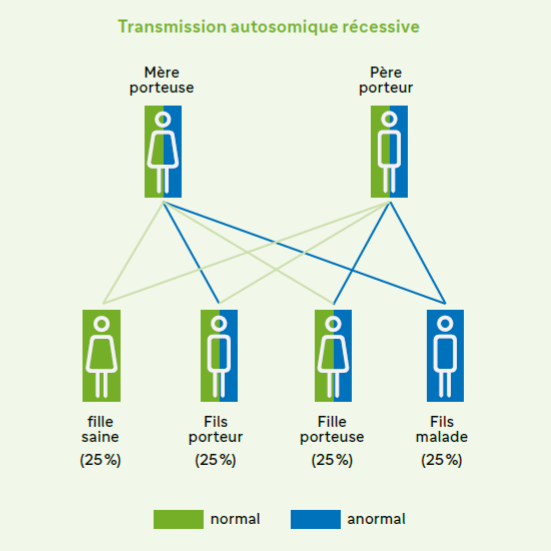 Lorsque les deux parents sont porteurs sains, tous les enfants ne naissent pas forcément avec la maladie. Chaque parent porteur sain possède un gène normal en plus du gène défectueux. Lorsque le père comme la mère possèdent un gène défectueux, il y a donc quatre possibilités aléatoires de transmission.