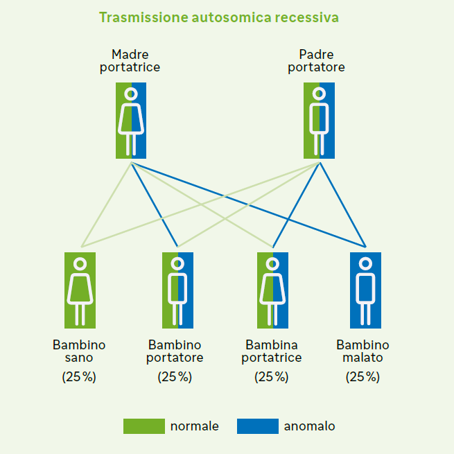 Le quattro possibilità di ereditare la malattia, ognuna con una probabilità del 25%, se entrambi i genitori portatori, sono: